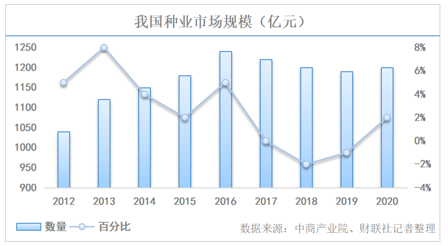 在種企大力推廣背后,是種子銷售市場趨于飽和的行業現狀。數據顯示,2016年至2020年,國內種子市場規模從1229.61億元下降至1199.89億元,種子市場規模趨于飽和,行業增速顯著放緩。根據中商產業研究院分析師預測,我國種子市場規模在2022年將達到1170.56億元。