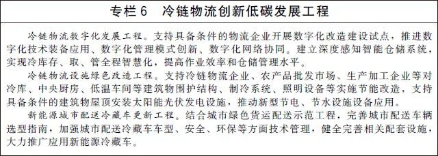 完善冷鏈多式聯運設施。鼓勵國家骨干冷鏈物流基地等完善吊裝、平移等換裝轉運專用設施設備,加強自動化、專業化、智慧化冷鏈多式聯運設施建設。因地制宜增強國家物流樞紐、綜合貨運樞紐冷鏈物流服務功能,推進港口、鐵路場站冷藏集裝箱堆場建設和升級改造,配套完善充電樁等設施設備。