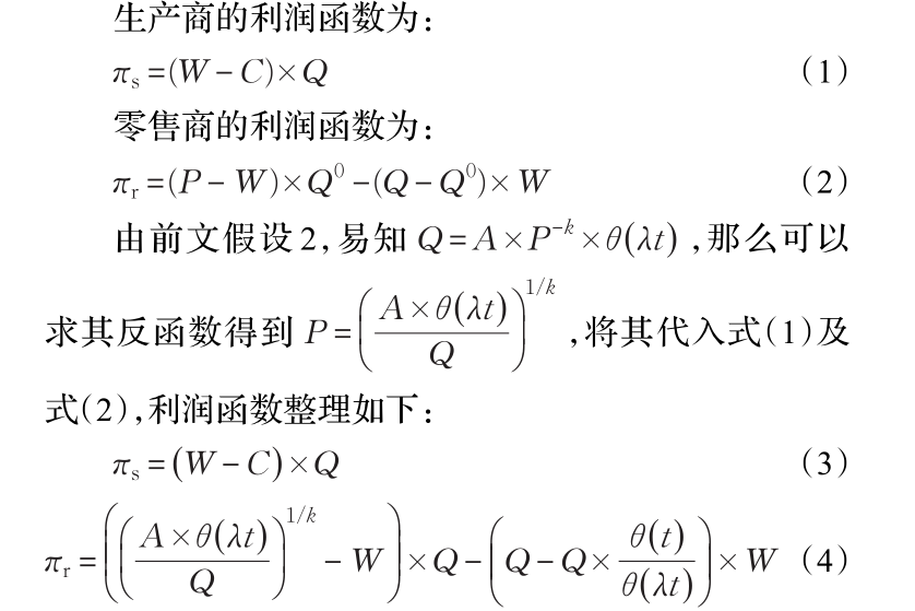 通過構(gòu)建基于區(qū)塊鏈技術(shù)的供應(yīng)鏈信息系統(tǒng),供應(yīng)鏈上各方成員都必須將產(chǎn)品的相關(guān)信息準(zhǔn)時(shí)準(zhǔn)確地上傳到該系統(tǒng)中,由于區(qū)塊鏈技術(shù)公開透明性以及信息不可篡改性,系統(tǒng)中的信息不能被任意修改,因此生產(chǎn)商將不能謊報(bào)鮮活度信息。此時(shí)供應(yīng)鏈上各方的利益函數(shù)分別為: