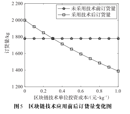同樣在此假設(shè)下,圖5反映了區(qū)塊鏈技術(shù)應(yīng)用前后的零售商的訂貨量不同,一開始應(yīng)用技術(shù)時(shí),零售商會(huì)提高其訂貨量,隨著技術(shù)投資成本越來越高,訂貨量會(huì)不斷下降,下降速度快。同時(shí)從圖4、圖5可以看出,區(qū)塊鏈技術(shù)投資成本閾值對(duì)訂貨量的影響要大于對(duì)價(jià)格的影響。