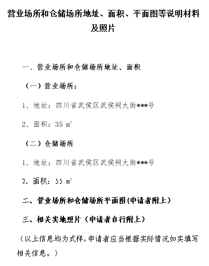 營業場所和倉儲場所地址、面積、平面圖等說明材料及照片: