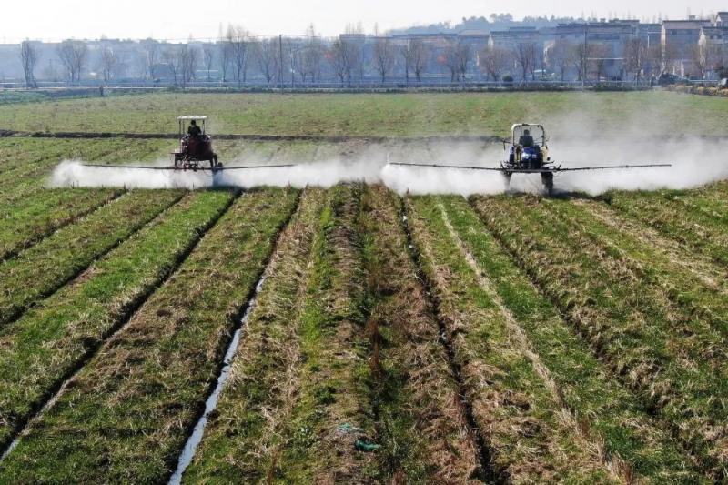 2020年2月20日,南京湖熟街道現(xiàn)代農(nóng)業(yè)示范園區(qū)內(nèi),工作人員駕駛自走式噴霧機(jī)給小麥噴灑除草劑。