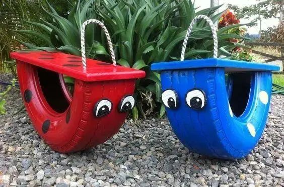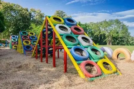 收集一些舊輪胎,涂上靚麗的顏色,給孩子們制造一些富有想象力的游樂設施。