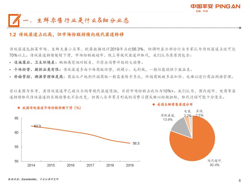 生鮮零售市場指在菜市場、超市、生鮮電商等終端零售途徑上向消費者銷售蔬果、肉蛋白、水產等生鮮產品的市場。根據歐睿數據估計,2020年生鮮零售市場規模可超5萬億。渠道分布上,菜市場等傳統渠道占比一半以上,超市、生鮮電商等現代渠道取代傳統渠道的空間巨大。