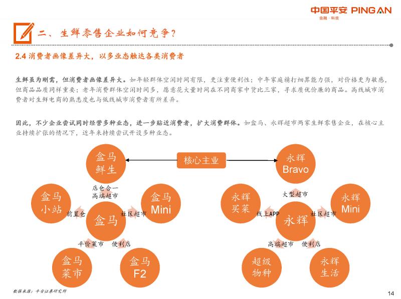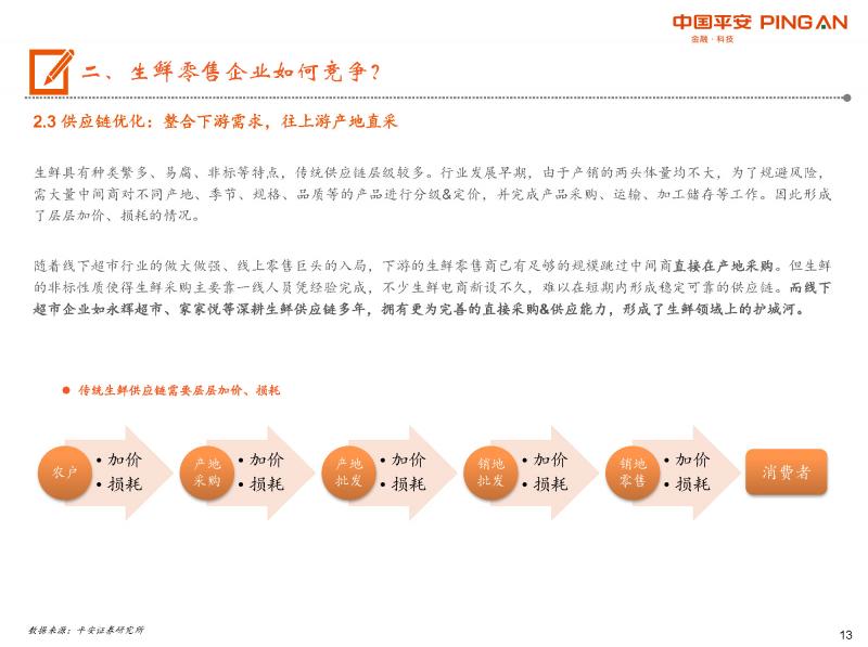 線上線下零售巨頭均在生鮮零售各領域大規模布局,行業開始劃分陣營對壘。其次,生鮮零售的盈利模型決定供應鏈&消費者觸達為競爭核心:1、企業不斷整合下游需求、往上游直采,持續優化供應鏈。2、企業嘗試同時經營多種業態,進一步貼近消費者,擴大消費群體。