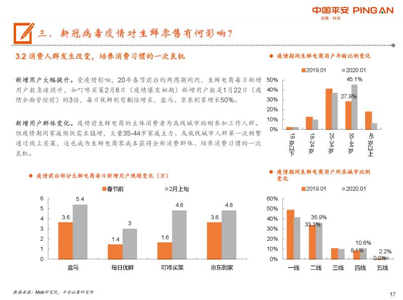 疫情導致線上買菜量價齊增,生鮮電商銷售額井噴。特別是新用戶數大幅增加、消費人群發生改變,因此本次疫情或是培養生鮮線上消費習慣的一次良機。但我們認為新消費者的留存可能并非易事:1、線上買菜模式未成熟,難以提供最佳消費體驗。2、隨著工作生活逐步回到正軌,家庭做飯、從線下轉移的需求或不可持續。3、需求退坡后補貼戰或將再起。