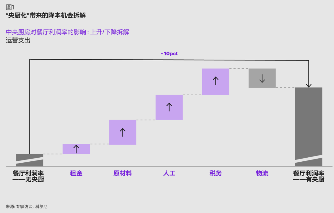 央廚化的集中操作可以幫助餐廳降低運營成本,從而提升約 10% 的利潤點(參見圖 1)。其中,集中采購帶來的原材料成本降低、專業化分工帶來的人員效率提升,以及稅務票據帶來的財務成本抵扣,影響最大。與此同時,成品、半成品物流在溫度、濕度等方面的品控要求更高,中心化的高頻次配送也會提升物流體系的復雜度,因此物流成本的提升會吃掉一部分利潤。整體而言,央廚不僅能夠幫助餐飲企業降低成本,在品質穩定性控制、集中化新品研發等方面,也能發揮積極的價值。