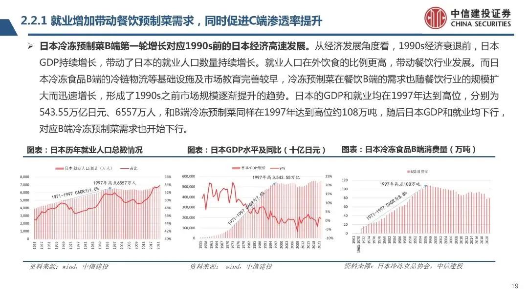 (1)隨著宏觀經濟的發展,首先帶來就業人口的增長。就業人口相比居家人口,在外飲食的場景相對更多,也會 帶動餐飲業發展,對應的B端預制菜需求增長。其次,就業人口回家做飯的時間少,烹飪的時間成本提高,也推動 預制菜在C端居家消費場景的滲透率提升。此外,1960s日本冷鏈物流等基礎設施的加速建設,以及1970s冰箱等 家電的基本普及,給B端和C端預制菜發展提供基礎。包括連鎖餐飲企業的發展、連鎖便利店的擴張,也在持續擴 張對預制菜的需求。