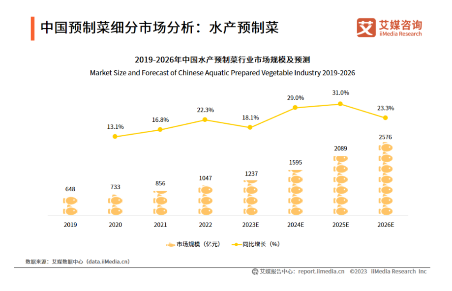 iiMedia Research(艾媒咨詢)數據顯示,2022年中國水產預制菜行業規模為1047億元,同比增長22.3%,預計2026年水產預制菜市場規模將達2576億元。隨著人們飲食的多元,消費結構的升級,水產預制菜市場將持續擴大規模。