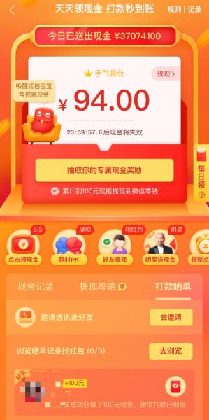 進入到一個動效非常多的頁面,title叫做《天天領現金,打款秒到賬》。