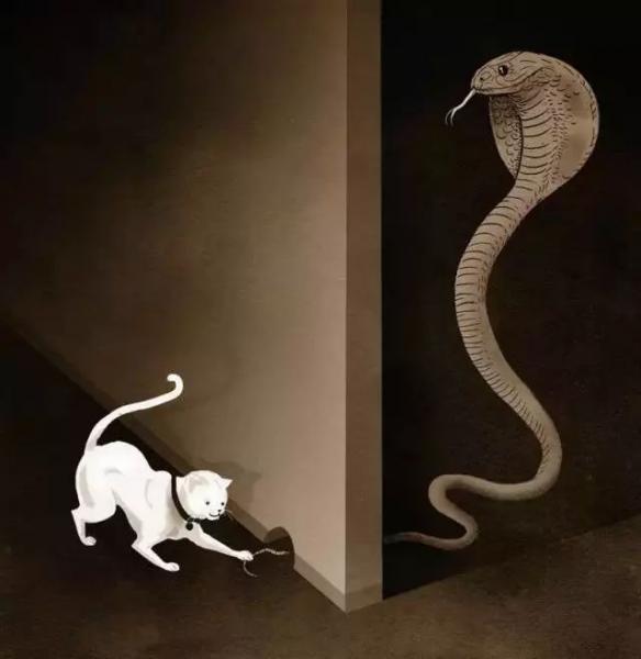 畫中的貓把蛇尾當(dāng)成鼠尾,毫不畏懼地用爪子抓著蛇的尾巴。