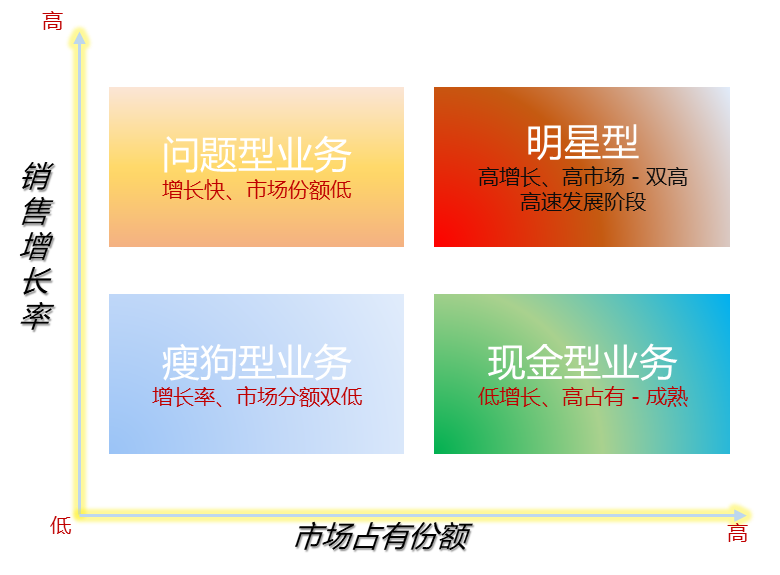 5、波士頓矩陣:也叫四象限分析法,根據銷售增長率和市場占有率可以將產品分為:明星類、瘦狗類、問題類和奶牛類。