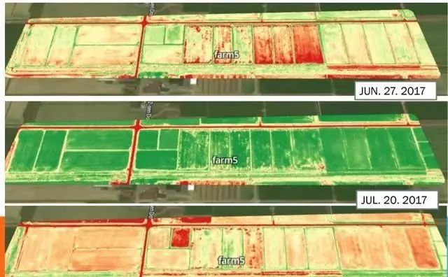 無人機不僅可以搭載傳統(tǒng)的可見光攝像頭,同樣也可以搭載紅外光等攝像頭,進行夜間巡邏以及生態(tài)確認(rèn)。上圖是對植生化指數(shù)的監(jiān)控,在不同的時期植物的生長情況不同。
