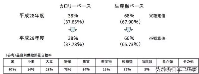 日本是世界上較大的農(nóng)產(chǎn)品進口國家之一,但是俗話講:兵馬未動,糧草先行。農(nóng)產(chǎn)品雖然目前在人們心中的地位有些下降,可是其“戰(zhàn)略物資”的地位并未動搖。日本同樣認(rèn)識到這一點,上圖是日本農(nóng)林水產(chǎn)省發(fā)布的資料,從上圖我們可以看出,在熱量(日本按照卡路里和生產(chǎn)額來劃分自給率)方面,日本的自給率達到了97%,蔬菜達到了75%,魚類是59%。
