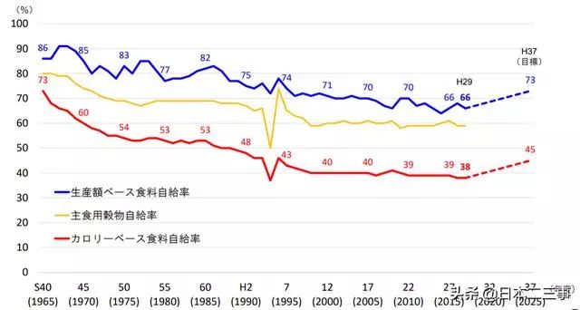我們再看一個“綜合供給率”的資料,上圖是日本從1965年到未來的2025年的自給率推移。