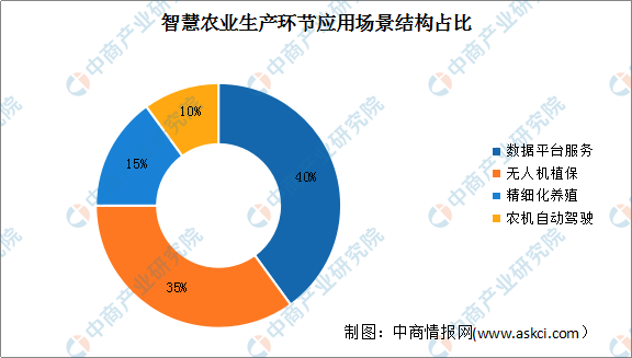 智慧農業的提出和發展,對于國家鄉村振興戰略的進一步實施有著重大作用。通過云計算及智能化管理多種模式,智慧農業將大大提升農業生產質量,推動農業的全面升級。目前,現代農業新技術則主要體現在智慧農業的生產環節上,主要包括數據平臺服務、無人機植保、精細化養殖、農機自動駕駛四大應用場景,并廣泛應用在農業種植和畜牧養殖上。其中,數據平臺服務和無人機植保累計占比達75%。