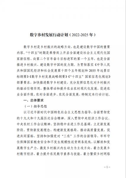 近日,中央網信辦、農業農村部、國家發展改革委、工業和信息化部、科技部、住房和城鄉建設部、商務部、市場監管總局、廣電總局、國家鄉村振興局印發《數字鄉村發展行動計劃(2022-2025年)》(以下簡稱《行動計劃》)。《行動計劃》立足我國“三農”工作重心歷史性轉向全面推進鄉村振興的發展形勢,落實《數字鄉村發展戰略綱要》《“十四五”國家信息化規劃》有關要求,對“十四五”時期數字鄉村發展作出部署安排,是各地區、各部門推進數字鄉村工作的重要指引。