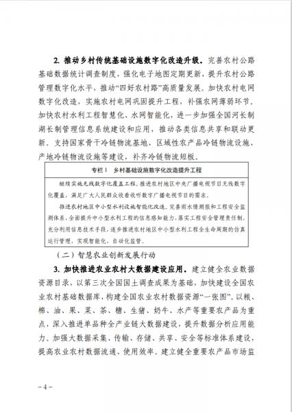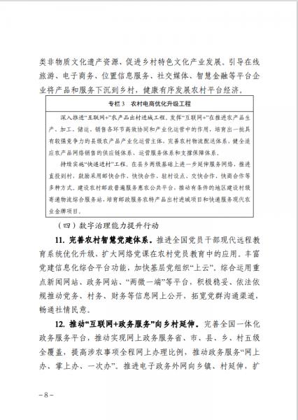 《行動計劃》部署了8個方面的重點行動。一是數字基礎設施升級行動,二是智慧農業創新發展行動,三是新業態新模式發展行動,四是數字治理能力提升行動,五是鄉村網絡文化振興行動,六是智慧綠色鄉村打造行動,七是公共服務效能提升行動,八是網絡幫扶拓展深化行動。同時,《行動計劃》還設立了鄉村基礎設施數字化改造提升工程等7項重點工程,作為落實上述行動的重要抓手。