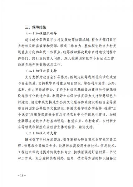 《行動計劃》提出,要堅持深化改革、創新驅動,堅持以人為本、內生驅動,堅持統籌協調、城鄉融合,堅持規劃引領、分類推進。到2023年,數字鄉村發展取得階段性進展。網絡幫扶成效得到進一步鞏固提升,農村互聯網普及率和網絡質量明顯提高,農業生產信息化水平穩步提升,“互聯網+政務服務”進一步向基層延伸,鄉村公共服務水平持續提高,鄉村治理效能有效提升。到2025年,數字鄉村發展取得重要進展。鄉村4G深化普及、5G創新應用,農業生產經營數字化轉型明顯加快,智慧農業建設取得初步成效,培育形成一批叫得響、質量優、特色顯的農村電商產品品牌,鄉村網絡文化繁榮發展,鄉村數字化治理體系日趨完善。
