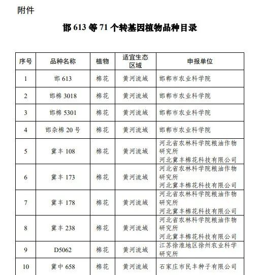 但是,71個轉基因植物98%限定在棉花領域,玉米授權北京大北農生物技術有限公司、大豆授權中國農業科學院作物科研所。