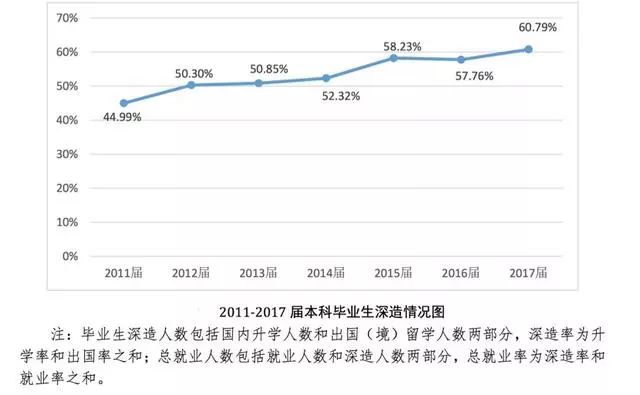 對(duì)此,記者在2017年的就業(yè)質(zhì)量報(bào)告中,找到了中國(guó)農(nóng)業(yè)大學(xué)官方披露的2011-2017屆本科畢業(yè)生深造情況圖表,在這份統(tǒng)計(jì)里,學(xué)校把國(guó)內(nèi)外升學(xué)人數(shù)做了統(tǒng)一計(jì)算、對(duì)比。從圖中觀察,2011屆本科畢業(yè)生升學(xué)率為44.99%,而到了2017屆時(shí),本科畢業(yè)生的升學(xué)率迅速竄升至60.79%,并存在逐年上升趨勢(shì)。