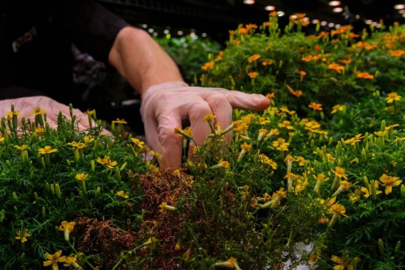 AeroFarms基地里,植物在垂直支柱上層層疊疊的托盤中生長(zhǎng),這些支柱高達(dá)36英尺(1英尺≈0.3048米)。托盤里鋪著擁有專利技術(shù)的布,也就是培養(yǎng)基,種子浸在上面發(fā)芽生長(zhǎng),沒(méi)有土壤、不使用殺蟲(chóng)劑,也不會(huì)浪費(fèi)營(yíng)養(yǎng)物質(zhì)。