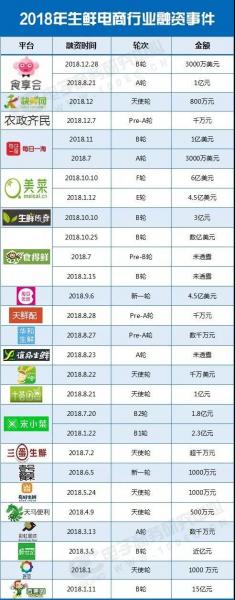 據(jù)電子商務(wù)研究中心不完全統(tǒng)計(jì),2018 年共有 22 家生鮮電商企業(yè)共融資近 120 億元人民幣。包括:百果園、食范、鮮世紀(jì)、彩虹星球、天馬便利、有好生鮮、壹號(hào)餐桌、三蛋生鮮、宋小菜、十薈團(tuán)、呆蘿卜、誼品生鮮、華和生鮮、天鮮配、每日優(yōu)鮮、食得鮮、生鮮傳奇、美菜網(wǎng)、每日一淘、農(nóng)政齊民、快鮮網(wǎng)、食享會(huì)等平臺(tái)上榜。