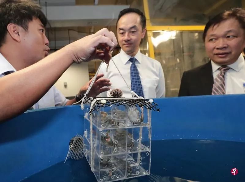(貿(mào)工部高級(jí)政務(wù)部長(zhǎng)許寶琨(中)和文萊初級(jí)資源與旅游部副常任秘書(shū)阿都·哈利迪(右)參觀淡馬錫理工學(xué)院的水產(chǎn)與獸醫(yī)學(xué)中心時(shí),向該理工院應(yīng)用科學(xué)系講師曾紀(jì)豪了解泥蟹的養(yǎng)殖過(guò)程。/ 海峽時(shí)報(bào))
