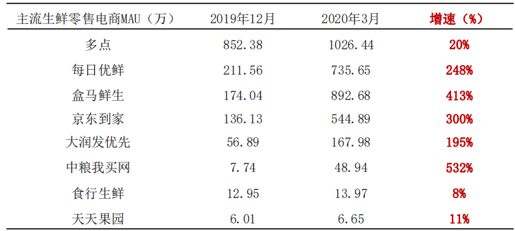 疫情爆發期間,主流生鮮零售電商MAU實現超高速增長,農產品上行加速。疫情期間,居民因居家隔離等原因,線上購買生鮮農產品的需求大大增加,2020年Q1,很多生鮮電商平臺MAU實現數倍增長。2020年全年,生鮮零售線上比例為14.6%,比2019年增加近6pct。農產品上行速度加快,糧油、肉禽蛋、奶類、蔬菜和豆制品五類農產品網絡零售額同比增速均超過30%,遠高于全國網上零售額增速10.9%。