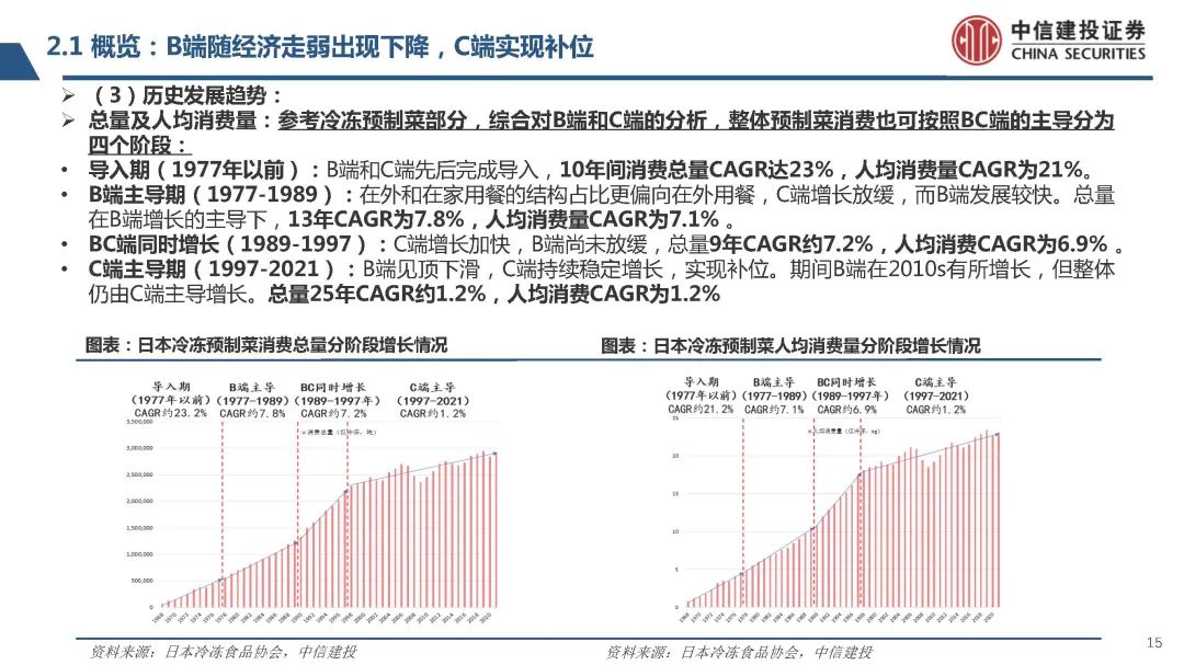 (1)隨著宏觀經濟的發展,首先帶來就業人口的增長。就業人口相比居家人口,在外飲食的場景相對更多,也會 帶動餐飲業發展,對應的B端預制菜需求增長。其次,就業人口回家做飯的時間少,烹飪的時間成本提高,也推動 預制菜在C端居家消費場景的滲透率提升。此外,1960s日本冷鏈物流等基礎設施的加速建設,以及1970s冰箱等 家電的基本普及,給B端和C端預制菜發展提供基礎。包括連鎖餐飲企業的發展、連鎖便利店的擴張,也在持續擴 張對預制菜的需求。