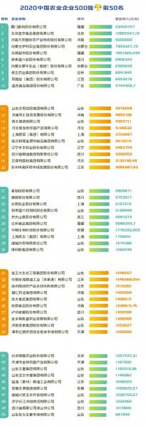 由農民日報社組織評定的2020中國農業企業500強發布,本次入圍門檻為5億元,入圍企業最多的省份為山東省,共151家企業上榜。本次農業企業評定主要參考營業收入和利潤,按照2018年企業營業收入進行排名,全國28個省(市、區)參與排名。其中營業收入過百億的農業企業有49家。