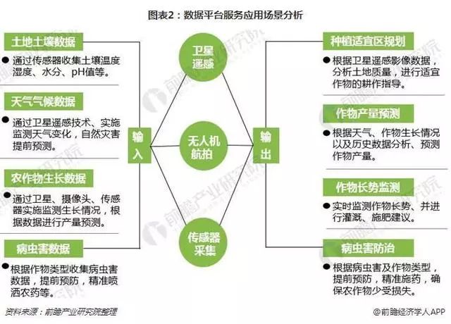 智慧農(nóng)業(yè)數(shù)據(jù)平臺服務(wù)應(yīng)用主要是通過衛(wèi)星遙感技術(shù)、無人機航拍以及傳感器采集三種方式進行數(shù)據(jù)采集,采集的數(shù)據(jù)主要包括土地土壤數(shù)據(jù)、天氣氣候數(shù)據(jù)、農(nóng)作物生產(chǎn)數(shù)據(jù)、病蟲害數(shù)據(jù)等,然后通過對收集到的數(shù)據(jù)進行分析、處理,并建立可視化模型,實現(xiàn)種植適宜區(qū)規(guī)劃、作物產(chǎn)量預(yù)測、作物長勢預(yù)測以及病蟲害防治等農(nóng)作物精準管理。目前我國專注于用無人機航拍收集數(shù)據(jù)的企業(yè)較少,衛(wèi)星遙感技術(shù)的較多。
