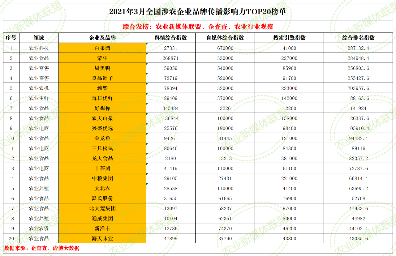 近日,由農業新媒體聯盟、企查查、農業行業觀察聯合發布的2021年1月份全國涉農企業品牌傳播影響力TOP20榜單..